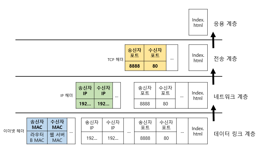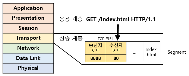 전송 계층은 포트 번호 정보가 헤더에 담기는데 여기선 임의로 송신자의 포트 번호를 8888로 하겠다.
