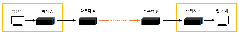 송신자가 웹 페이지를 요청하면 먼저 스위치 A에게 수신자의 MAC 주소를 질의하는데 웹 서버는 다른 네트워크에 있으므로 스위치 A는 MAC주소를 모른다. 따라서 수신자의 MAC 주소를 라우터 A의 MAC 주소로 변경한 후 해당 데이터를 라우터 A에게 보낸다.