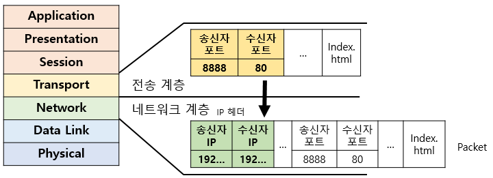 이후 아래의 계층들에선 통신을 위해 필요한 정보를 담은 헤더를 추가한다.