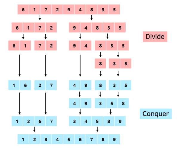 배열을 반으로 나누고 그 배열을 다시 반으로 나누면서 해결해야 하는 문제를 줄인다.(D&C)