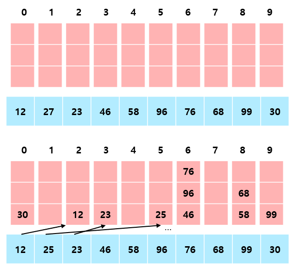 1. 0 ~ 9까지 값을 담을 10개의 버킷(Bucket)을 준비한다.(Bucket = 큐(Queue))
