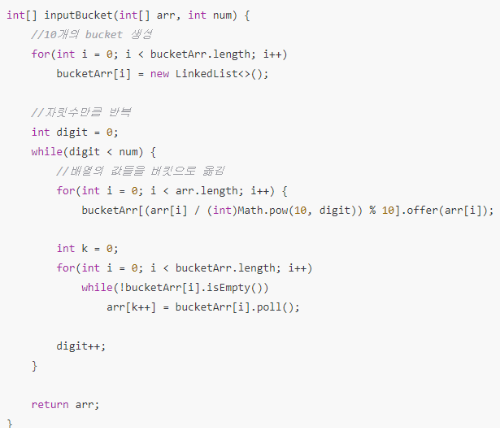 bucketArr[(arr[i] / (int)Math.pow(10, digit)) % 10].offer(arr[i]);
