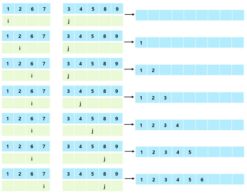 각 배열을 가리키는 포인터를 이용한다. 더 작은 값을 배열에 담고 1을 증가시키는 과정을 거친다.
