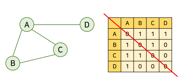 위 그래프는 무방향 그래프이기 때문에 중간(빨간 선)을 기준으로 값이 대칭이다.