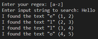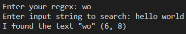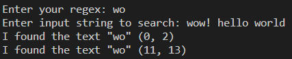 예를 들어 "hello world"에서 "wo"를 찾고 싶을 때 간단히 regex를 "wo"로 작성하면 된다.