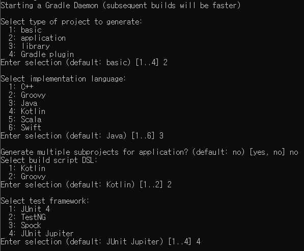 From inside the new project directory, run the init task using the following command in a terminal: gradle init. When prompted, select the 2: application project type and 3: Java as implementation language. Next you can choose the DSL for writing buildscri