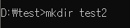 아래와 같이 D:\test로 이동한 후 mkdir test2를 입력하면