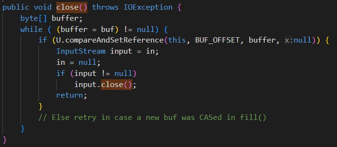 아래는 보조 스트림의 close() 메서드로 if문을 통해 기반 스트림의 close()를 실행하는 것을 볼 수 있다.
