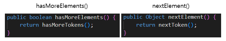 실제로 hasMoreElements()와 nextElement()는 각각 hasMoreTokens()와 nextToken()을 반환한다.