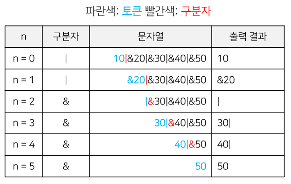 아래 코드는 문자열 "10|&20|&30|&40|&50"에 대해 구분자를 "|"에서 "&"로 바꾼 결과를 출력한다.