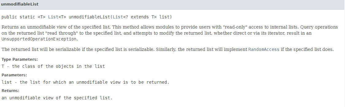 Oracle 문서의 Collections 클래스를 확인해 보면 아래와 같이 각 자료구조에 따른 unmodifiable 메서드가 정의되어 있다.
