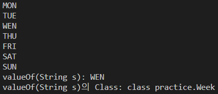 System.out.println("valueOf(String s)의 Class: " + Week.valueOf("WEN").getClass());