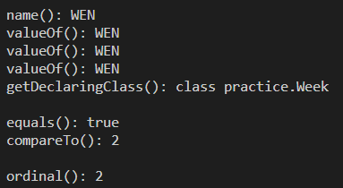 System.out.println("equals(): " + week.equals(Week.WEN));