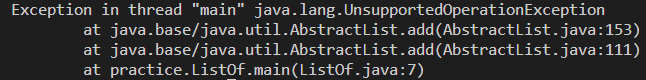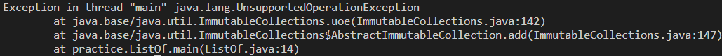 간단히 add()를 사용해 보니 UnsupportedOperationException이 발생했다. 요청한 작업이 지원되지 않을 때 발생한다.