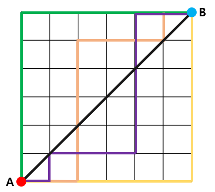 간단히 표현하자면 가로, 세로로만 이동했을 때 거리의 합이다.